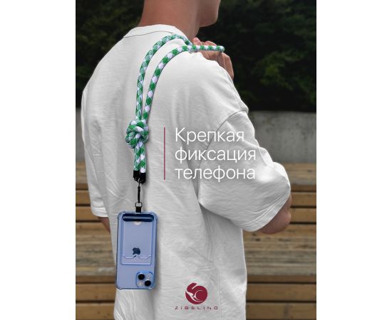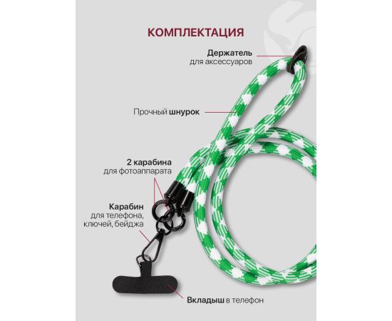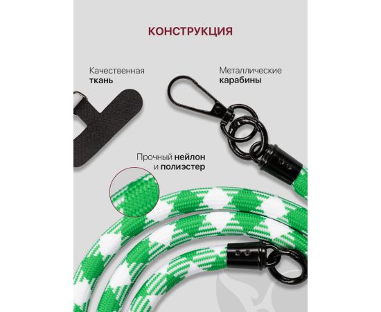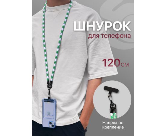 Шнурок универсальный 120см: для телефона на шею, для ключей, бейджа, пропуска, ремешок веревка через плечо, на руку, с карабином нейлоновый регулируемый, зелено-белый клетчатый