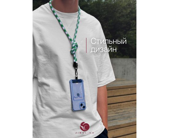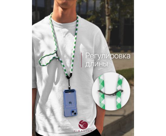 - Регулируемая длина. Шнурок можно носить разными способами: на шее, через плечо, на руке, на запястье или как кросс боди для телефона. Длина регулируется при помощи петли для аксессуаров.