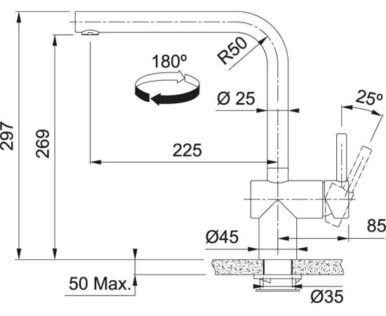 Угол поворота излива, град.: 180