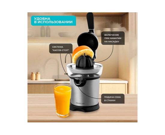 Соковыжималка оборудована системой "Капля-стоп", предотвращающей протекание сока после использования, а также фильтрацией мякоти, что позволяет получать чистый сок без лишних примесей. В комплект входят 2 сменные конусообразные насадки для разных размеров фруктов, что делает устройство универсальным для использования с любыми цитрусовыми.