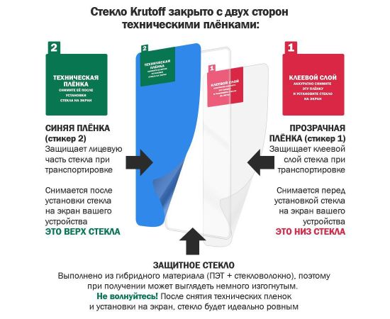 ГИБРИДНОЕ защитное стекло сохраняет гибкость защитной пленки, и прочность стекла. Оно намного удобнее обычного закаленного стекла - как при транспортировке, так и при установке. Гибридное стекло тоньше, прочнее и надежно защищает смартфон от повреждений. Имеет отступы по 1 мм от края дисплея для удобства ношения защитного чехла. Оно имеет высокую степень устойчивости к царапинам, обеспечивает хорошую чувствительность к касанию и не влияет на сенсорный отклик по всей поверхности дисплея. Идеально прозрачное, не снижает четкость и яркость изображения, не меняет оригинальную цветопередачу. Изготовлено из гибкого композиционного материала (стекловолокно и ПЭТ). Верхний слой из стекловолокна по тактильным ощущениям близок к стеклу и не влияет на работу сенсора по всей поверхности экрана. Гибридное стекло гибкое, оно не растрескивается и не крошится, как обычное закаленное стекло. Защищает от пыли, грязи, брызг и царапин. Полная проклейка поверхности (Full Glue). Специальная смесь высококачественных клеев гарантирует установку без пузырьков воздуха и что стекло не отслоится с течением времени. Внимание! Гибридное стекло поставляется в двух защитных транспортировочных пленках (на тыльной и лицевой стороне). Данные пленки могут быть поцарапаны. После наклеивания стекла снимите защитную синюю пленку "2" с лицевой стороны!