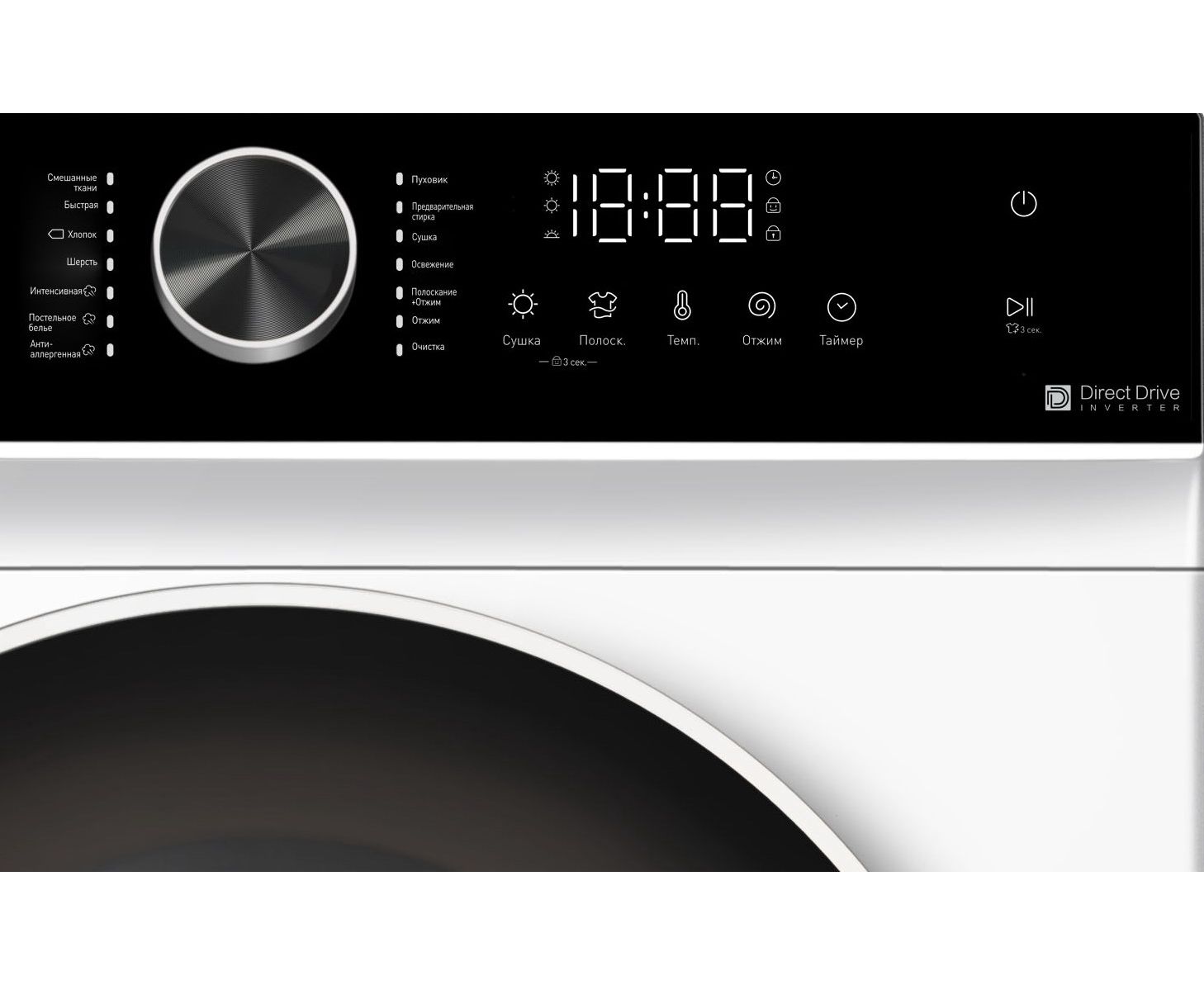Антибактериальная защита, Автоматическая блокировка двери, защита от перелива, защита от перегрева, Автобалансировка барабана, Черная матовая панель управления, Большой премиальный люк с хромированным ободом