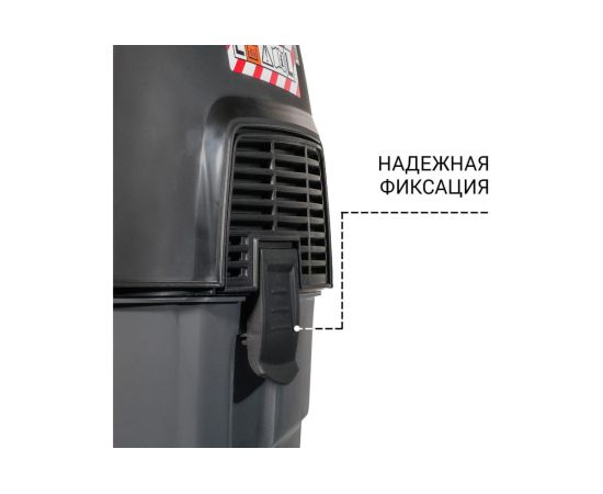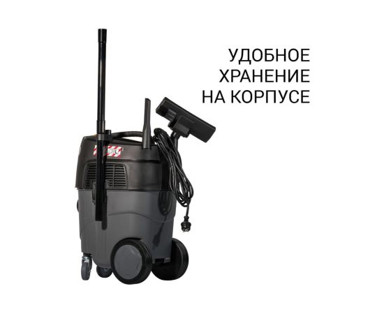 Объем бака пылесоса составляет 30 литров, что позволяет собирать большое количество мусора и пыли без перерывов на его очистку. Кроме того, устройство оснащено датчиком отключения при сборе воды, что обеспечивает безопасность в работе и предотвращает поступление влаги в мотор при переполнении бака.