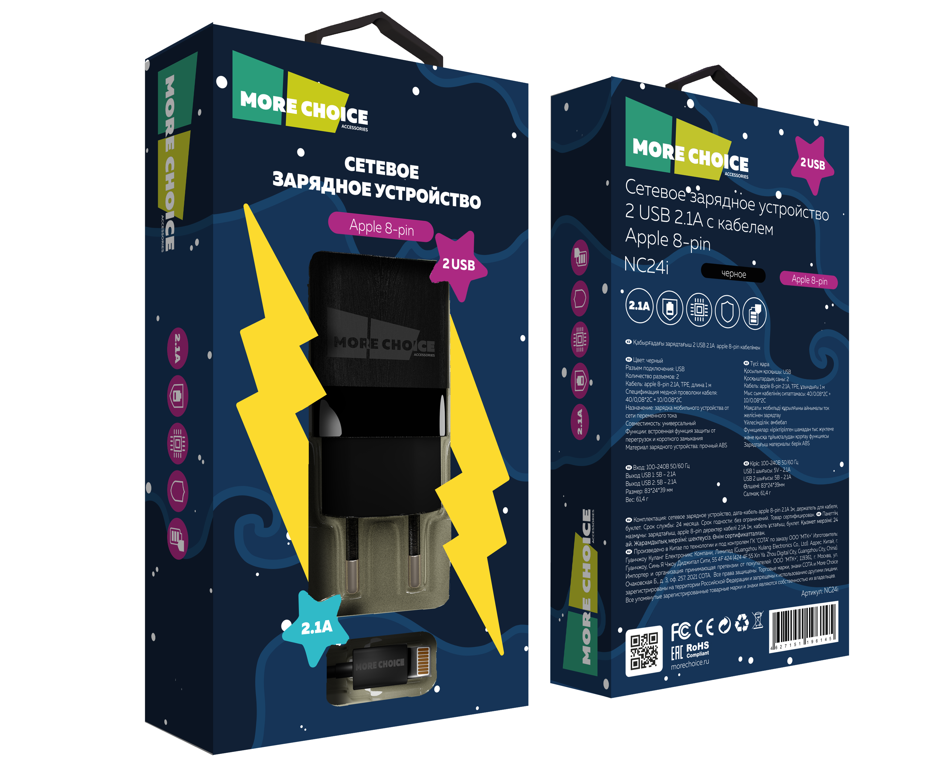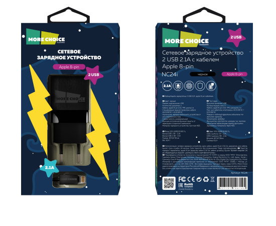 СЗУ 2USB 2.1A для Lightning 8-pin More choice NC24i (Black)