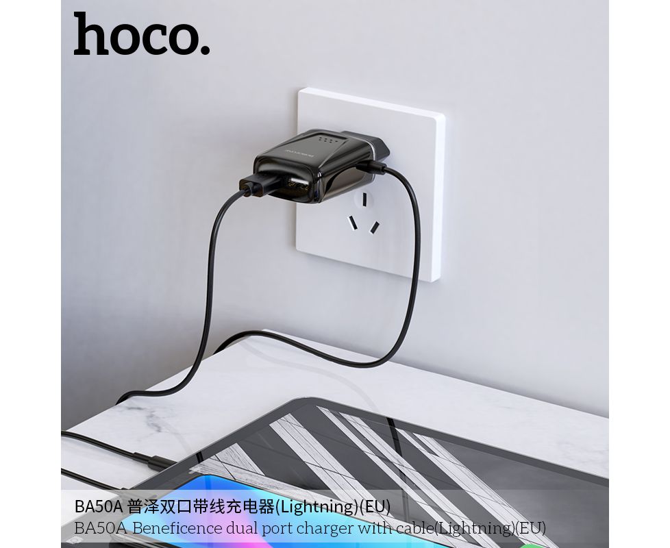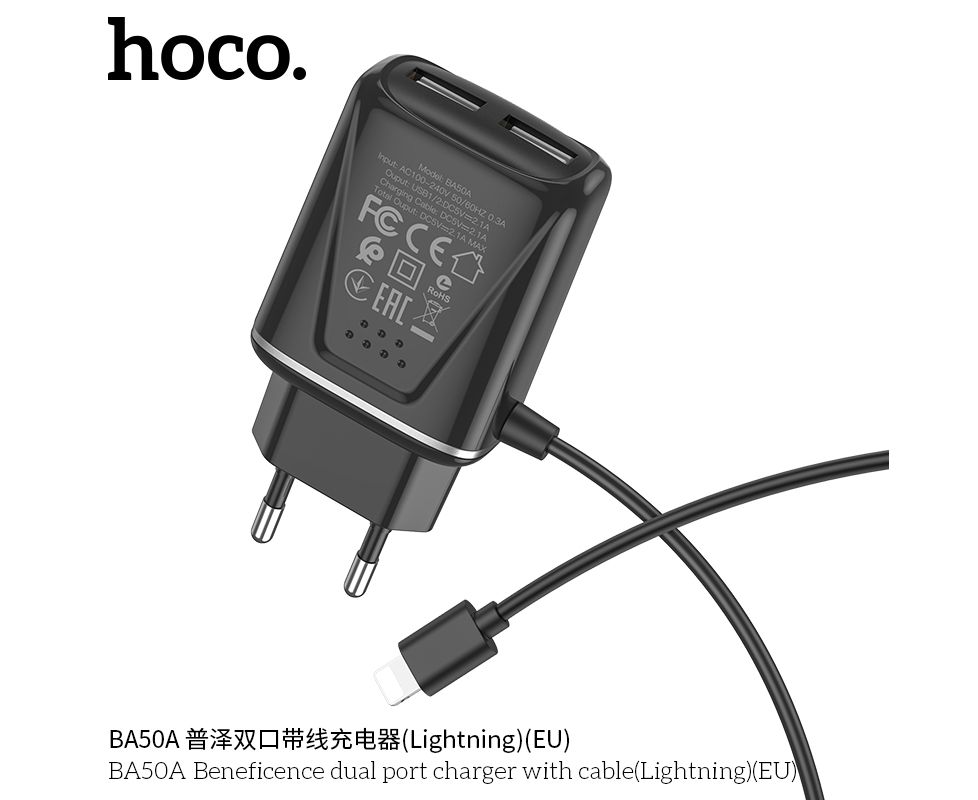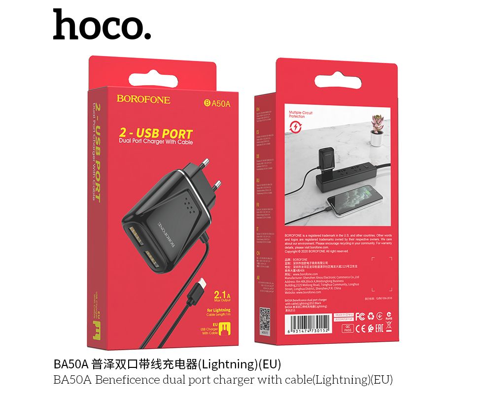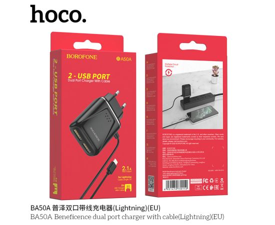 СЗУ 2USB 2.1A для Lightning 8-pin со встроенным кабелем Borofone BA50A 1м изготовлен из материала АВС-пластика, что не позволяет нагреваться. Имеет 2 выхода USB со встроенным кабелем для Lightning, microUSB, USB-C.