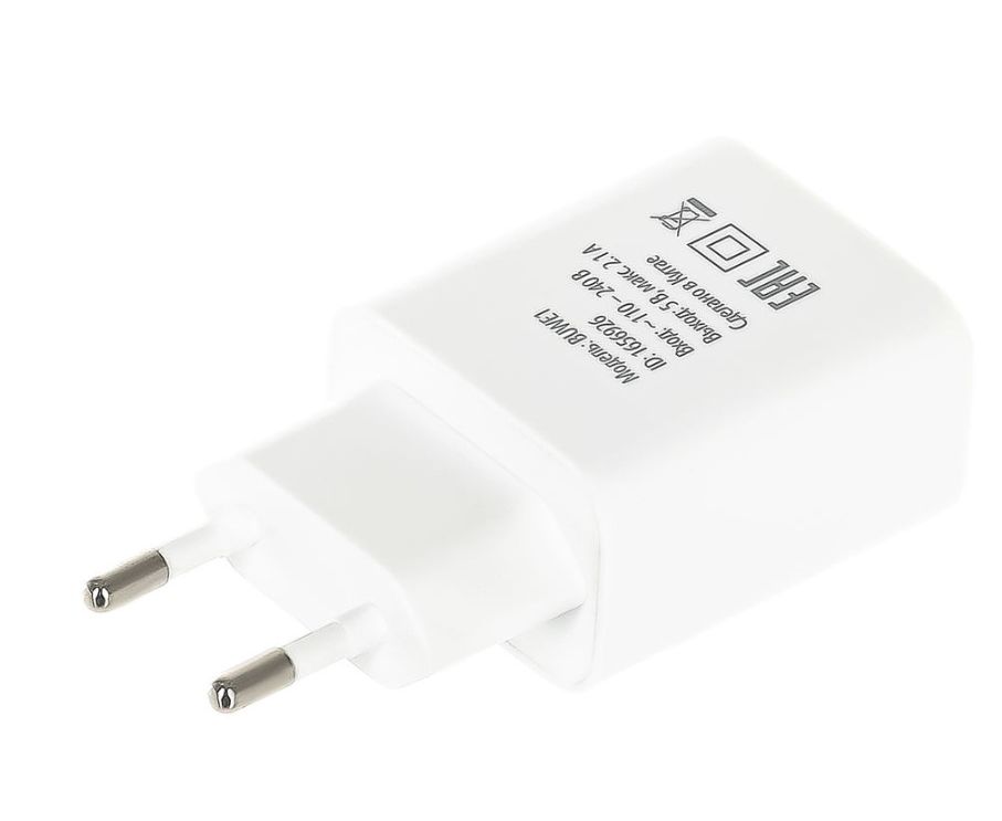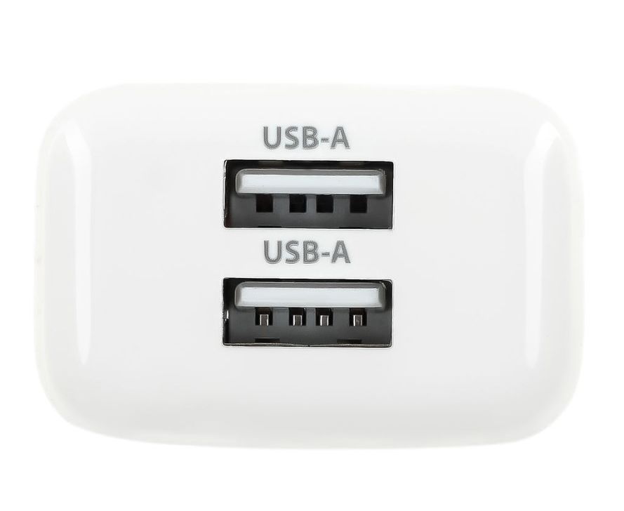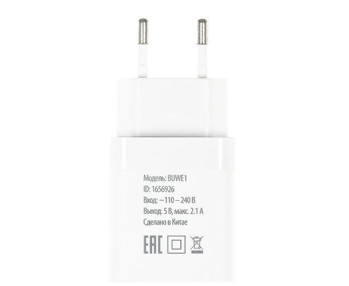 Универсальное сетевое зарядное устройство с 2 выходами USB-A с максимальной суммарной силой тока 2.1 А, позволяющее заряжать мобильные устройства разных производителей.