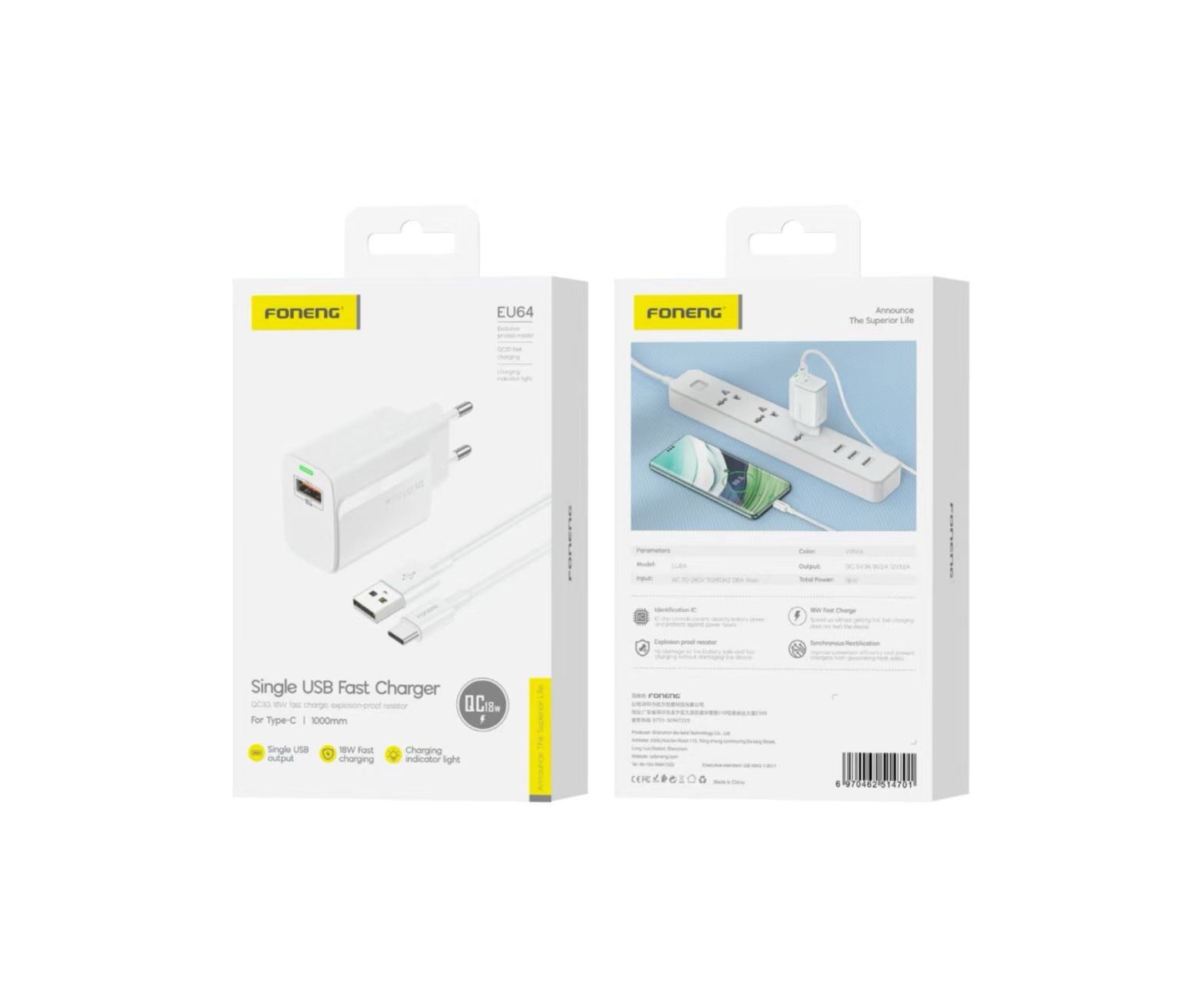 СЗУ Foneng EU64 3A (1USB) + кабель Type-C (White)