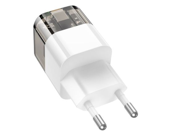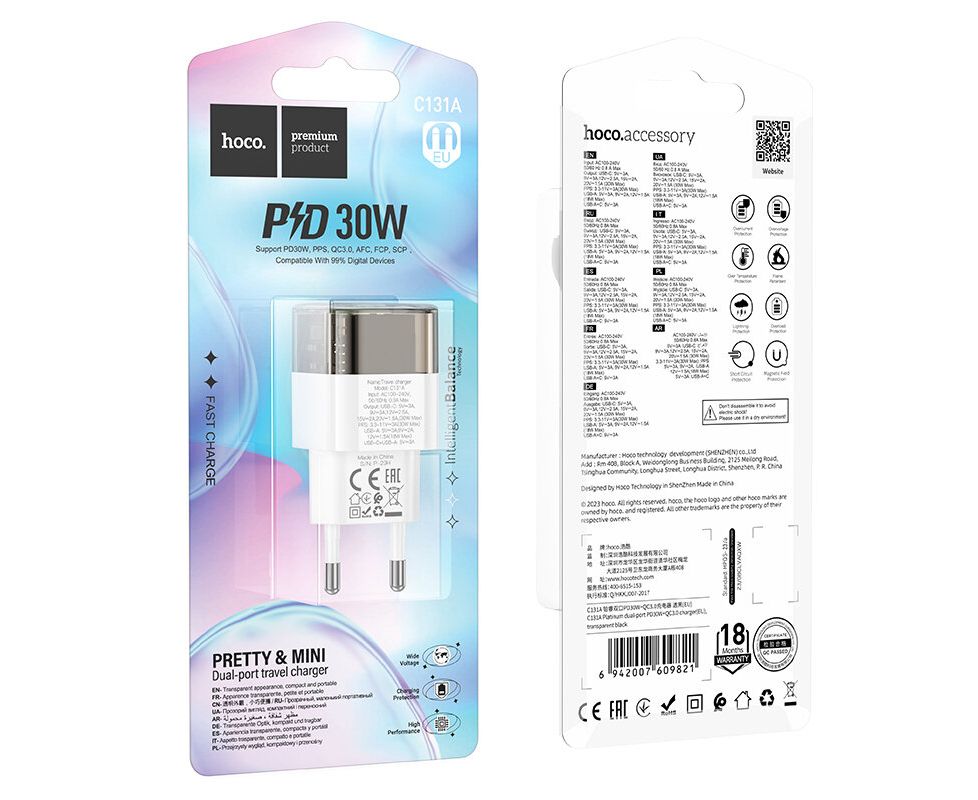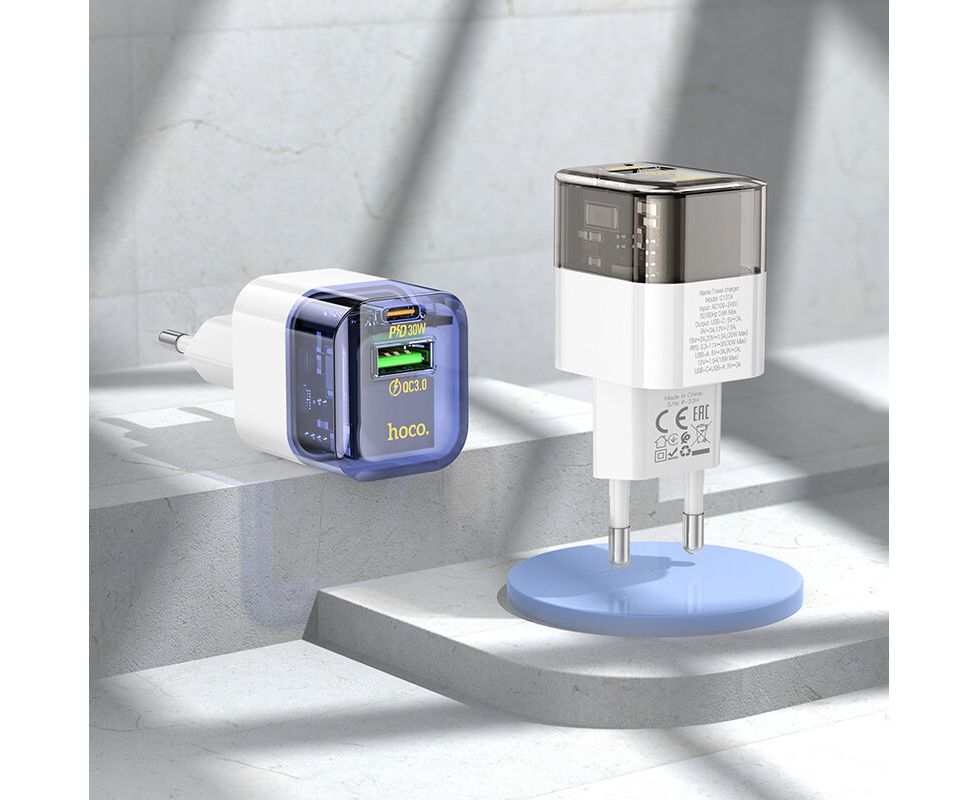 сетевое зарядное устройство, Блок питания сетевой HOCO C131A, 1 USB, Type-C, PD30W + QC3.0, цвет: прозрачный чёрный, от сети 220В, сетевой,универсальный