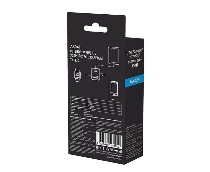 СЗУ Maxvi A304T Type-CUSB 3A 15W + литой кабель Type-C 1.2м white