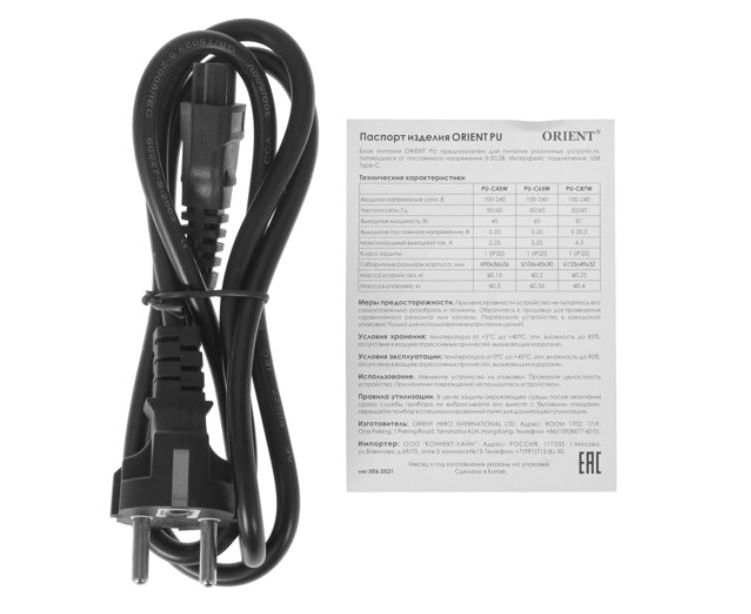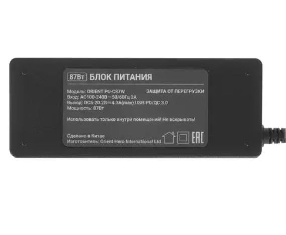 Сетевое зарядное устройство ORIENT PU-C87W, быстрая зарядка, 87Вт, Quick Charge 3.0+Power Delivery, выход: Type-C кабель 1.8 м