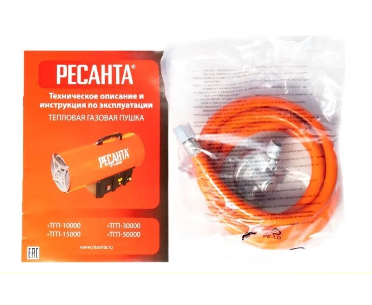 Тепловая пушка, Ручка, Газовый шланг, Регулятор давления, Паспорт (инструкция), Упаковка.