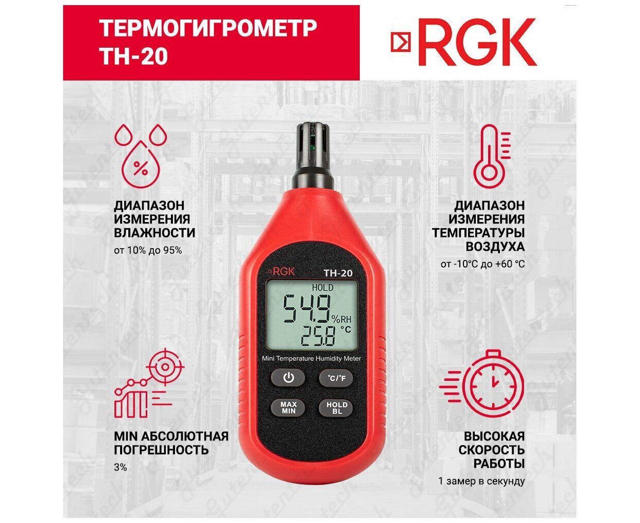 Термогигрометр RGK TH-20 776486 - измерительный прибор, который предназначен для определения температуры и влажности окружающей среды.