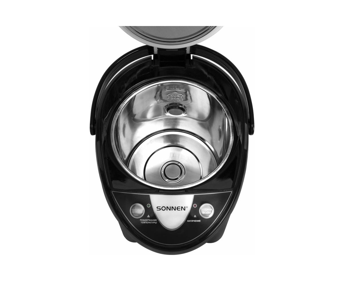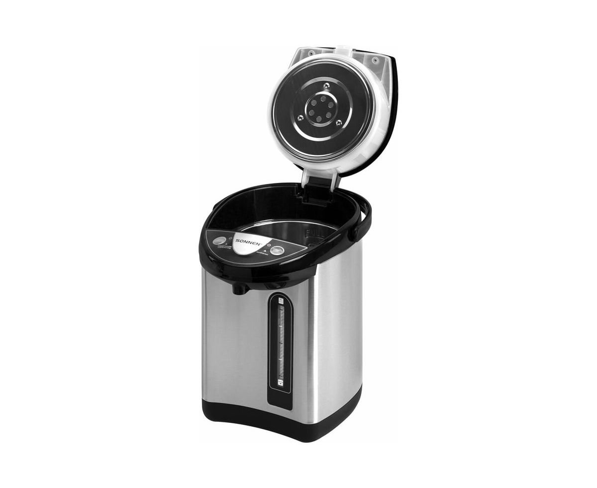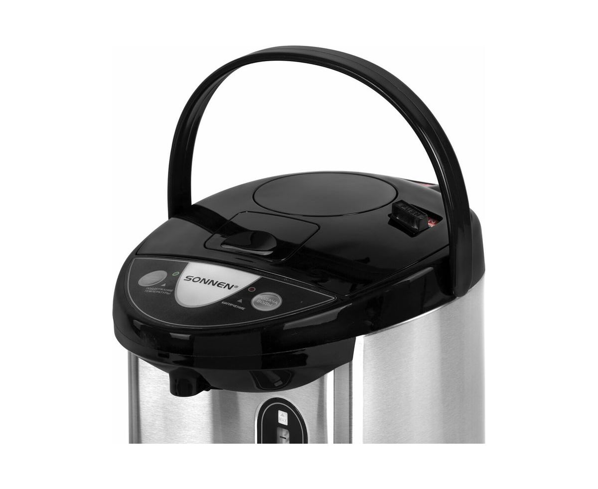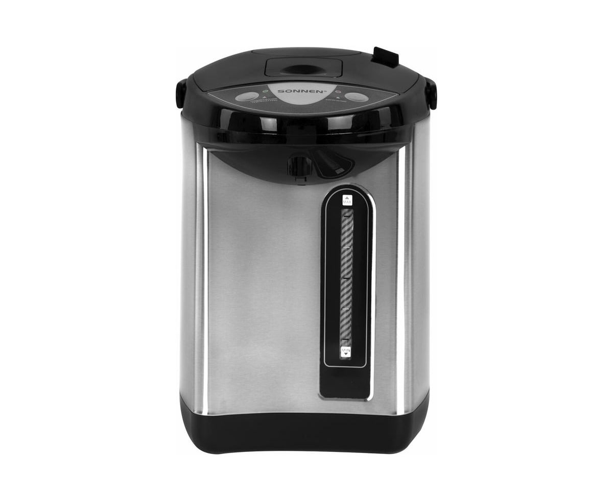 Термопот SONNEN TP-38, 4л, 900Вт, 1 температурный режим, 3 режима подачи воды, сталь, черный/серебро