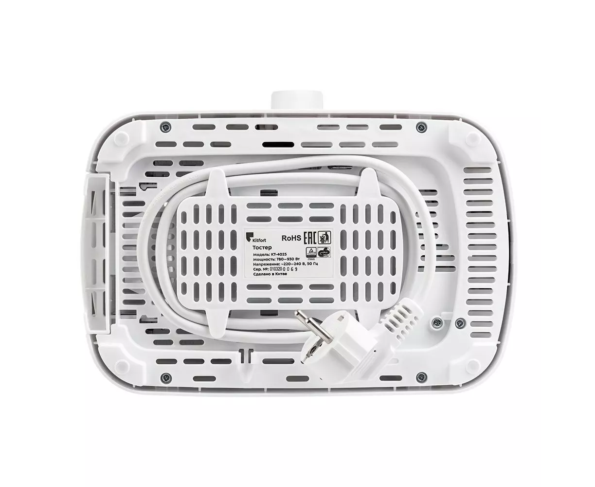 На дне корпуса тостера имеется отсек для хранения шнура, в который можно смотать излишки шнура электропитания, чтобы он не мешал на столе.