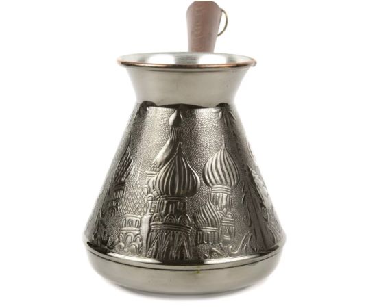 Медная турка классической конусообразной формы с утолщённым дном предназначена для приготовления ароматного натурального кофе. Внутренняя поверхность покрыта пищевым оловом. Наружная сторона украшена оригинальным орнаментом.