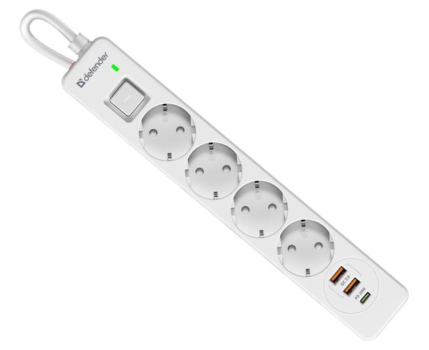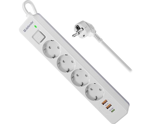 Сетевой фильтр DEFENDER с сетевым фильтром DFS 143 3 м, белый, 4розетки, USB+TypeC (99434)