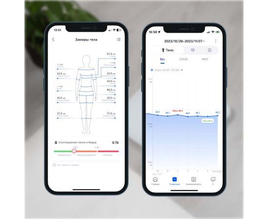 За изменениями веса, индекса массы тела, скорости базового обмена веществ и общей оценкой можно следить в журнале или на удобном графике прямо на главной странице приложения. Оно доступно для iOS и Android. Данные от весов синхронизируются с Apple Health и Google Fit.