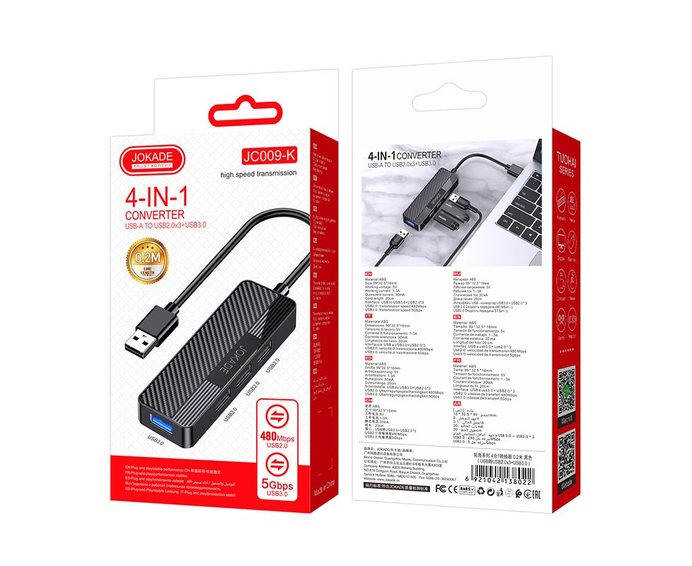 USB HUB Jokade JC009-K 4 in 1 на 3 USB 2.0 + 1 USB 3.0 black