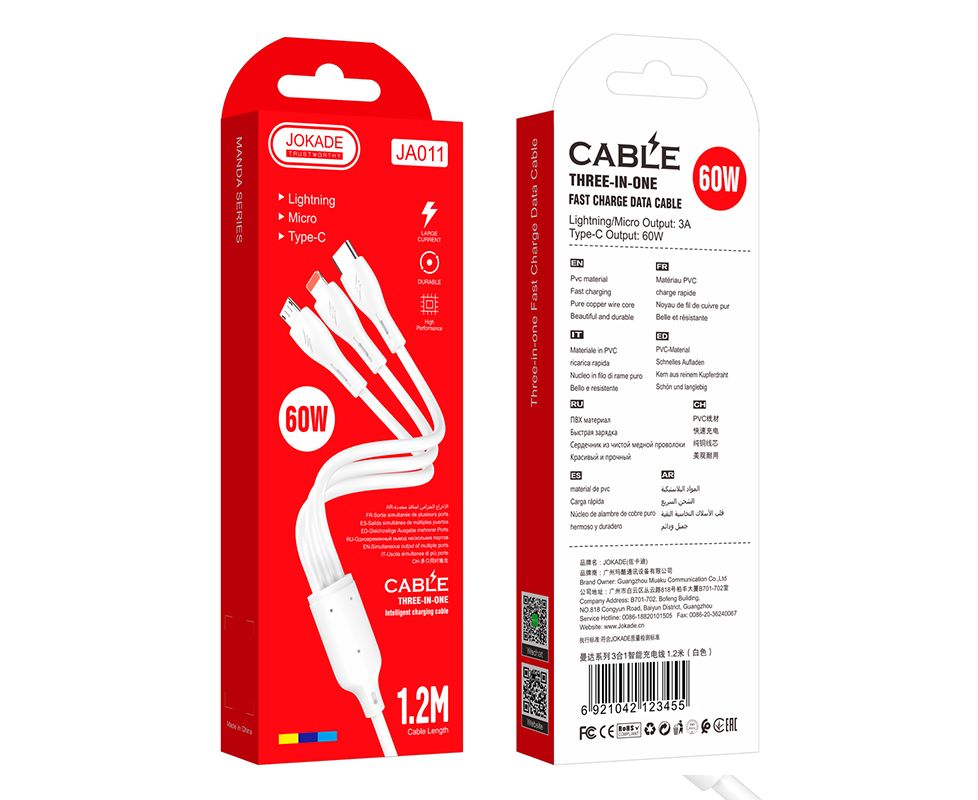 USB кабель JOKADE JA011 3 in 1 smart charging cable 1.2 m white
