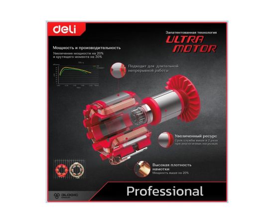УШМ оснащена двигателем «Ultra Motor» – это эксклюзивная запатентованная технология собственной разработки компании Delitools. Она обеспечивает повышенную мощность и эффективность работы, а также снижает уровень вибрации. Это позволяет мастеру проводить длительные работы с меньшим утомлением и повышает качество выполняемых работ.
