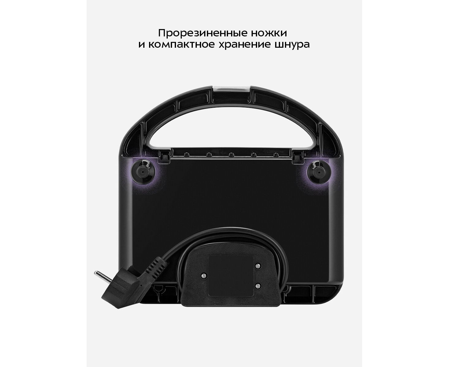 Прорезиненные ножки не дают прибору скользить по столу во время готовки. На нижней части корпуса прибора расположен держатель шнура, обеспечивающий удобство переноски и хранения.