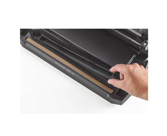 Вакууматор позволяет изготовить пакеты необходимой длины — для этого предусмотрены отсек для рулонов и резак. Чтобы отрезать пакет, достаточно положить рулон в отсек, вытянуть часть пленки и потянуть ползунок ножа. Затем положить открытым краем на сварную планку и запаять.
