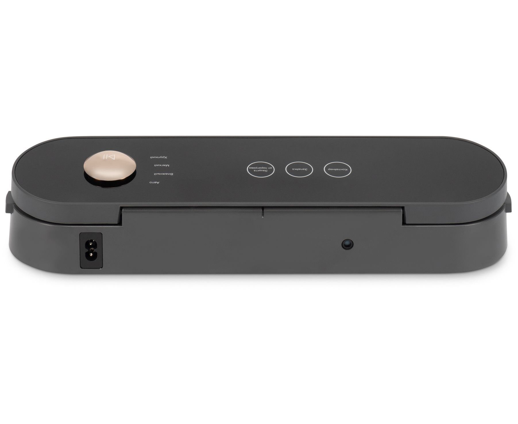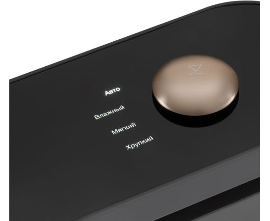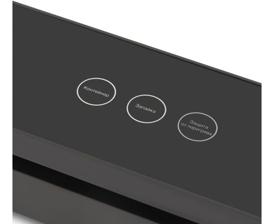 Акриловая поверхность, сенсорное управление+колесо, 6 программ, откачака 4л/минуту, макс. давление -65Kpa, шум 65-70dB, съемный нож, насадка для вакуумации контейнеров, 10 пакетов 20*30см в комплекте.