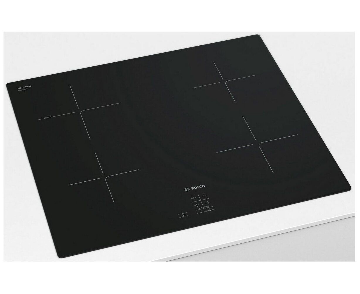 Удобство и функциональность кухни достигается использованием соответствующей бытовой техники. К ней относится и варочная панель Bosch PUG61KAA5E электрическая индукционная, встраиваемая. Она обладает высоким КПД, способна обеспечить один из самых быстрых нагревов. Также варочная панель Bosch PUG61KAA5E имеет стильный дизайн и легко станет отличным дополнением к интерьеру любой кухни. Бытовая техника выполнена в корпусе черного цвета. Основной материал изготовления устройства - стеклокерамика. Это высокопрочный, надёжный и экологически чистый материал. Стеклокерамическая варочная поверхность Bosch PUG61KAA5E превосходно выглядит, ее легко содержать в чистоте. Индукционная варочная панель располагает 4 конфорками. Конфорка передняя левая: 145 мм, 1.4 кВт. Конфорка левая задняя: 180 мм, 1.8 кВт (макс. мощность 3.1 кВт). Конфорка задняя правая: 145 мм, 1.4 кВт. Конфорка передняя правая: 180 мм, 1.8 кВт. Подключаемая мощность: 4600 Вт. Класс энергопотребления - А. Размеры рабочей поверхности - 5,1х59.2х52.2 см (ВхШхГ). Габариты ниши для встраивания - 5,1х56х49см (ШхГ). Варочная панель индукционная, особенности и преимущества: интуитивно простое сенсорное управление, функция распознавания наличия посуды, индикатор остаточного тепла, таймер с автоотключением, кабель с вилкой. Основные характеристики. PowerBoost - максимальная скорость. При готовке порой просто необходимо быстро увеличить нагрев. Усовершенствованная функция PowerBoost, в варочных панелях Bosch, повышает мощность для ускорения процесса нагрева и закипания. Просто включите конфорку и активируйте функцию PowerBoost. Чтобы дети не смогли случайно включить прибор или изменить установки, он оборудован специальной функцией "Блокировка от детей". Активация функции блокировки панели управления очень проста - достаточно перевести переключатель выбора функций в нулевое положение. И удерживать нажатой кнопку с изображением ключа 4 секунды. Все просто и ребенок защищен. При индукционном нагреве тепло генерируется в днище посуды. Сама конфорка почти не нагревается. Это обуславливает преимущества индукционных конфорок: более высокая скорость нагрева, экономичность, нет опасности серьезных ожогов, исключено пригорание, для чистки достаточно протереть поверхность салфеткой. QuickStart. Простота, удобство, точность. Просто поставьте сковороду или кастрюлю на варочную поверхность и Функция QuickStart сама активирует конфорку, на которой установлена посуда: при включении варочная панель автоматически выбирает конфорку с посудой (в выключенном состоянии). Удобство использования - 9 ступеней мощности. С функцией Power Management можно установить мощность подключения в соответствии с параметрами электросети: при необходимости ограничьте максимальную мощность (зависит от защиты электроустановки предохранителями). Необходима качественная и функциональная бытовая техника на кухню? Индукционная варочная поверхность Bosch PUG61KAA5E станет отличным выбором.