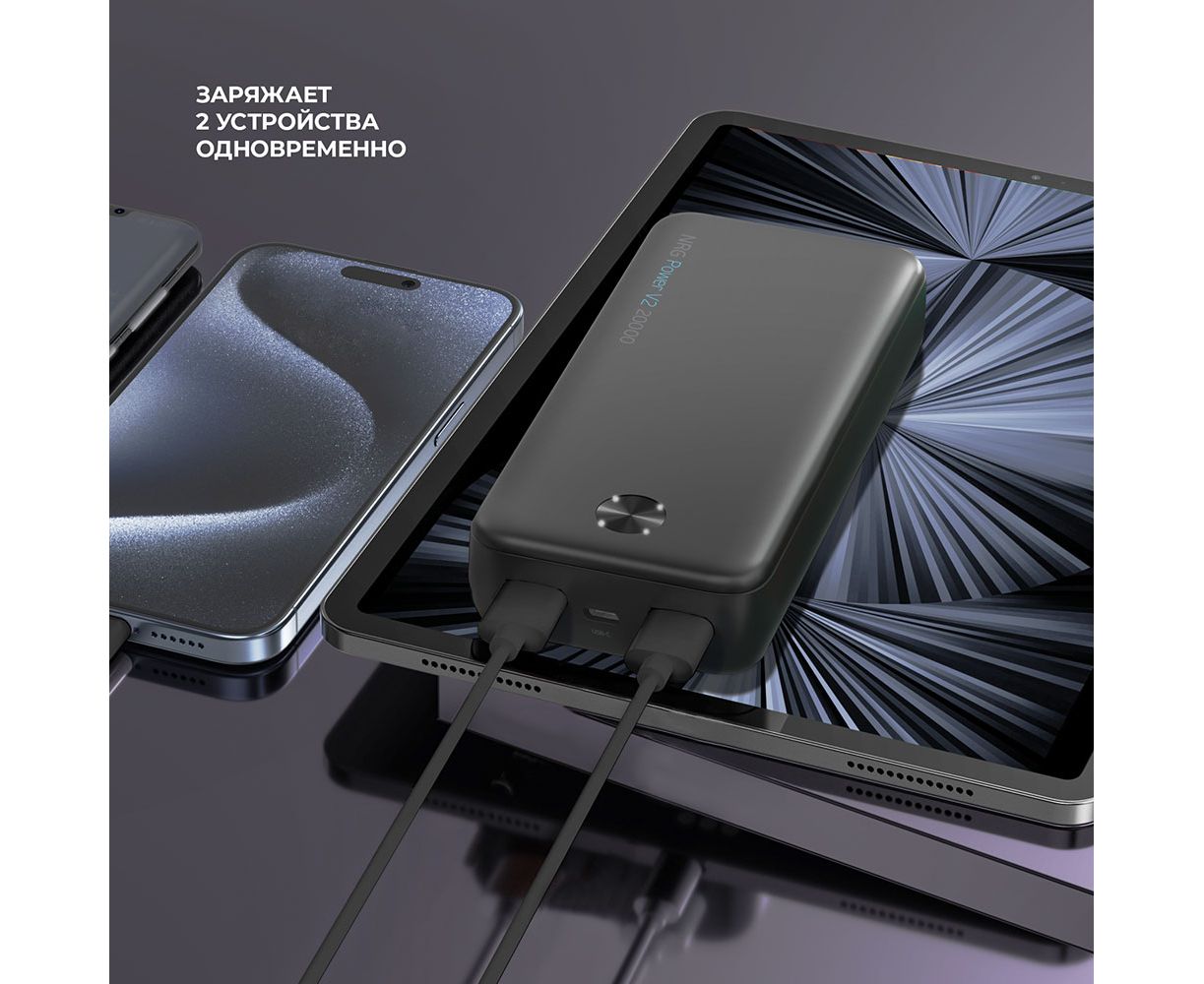 Внешний аккумулятор 20000 мА-ч, оснщенный светодиодным индикатором уровня заряда. Выполнен в прочном пластиковом корпусе.