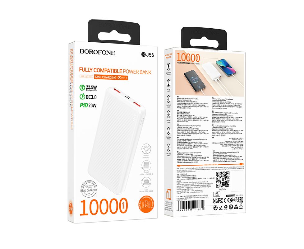 Внешний аккумулятор 10000mAh 2USB+Type-C PD 20W+22,5W быстрая зарядка LED Borofone BJ56 (White)