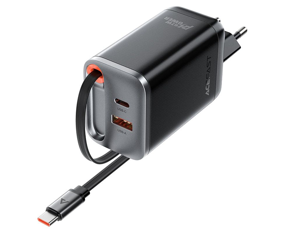 СЗУ ACEFAST A111 PD67W Gan Charger 2*USB-C+USB-A With Retractable Cable с кабелем. черный