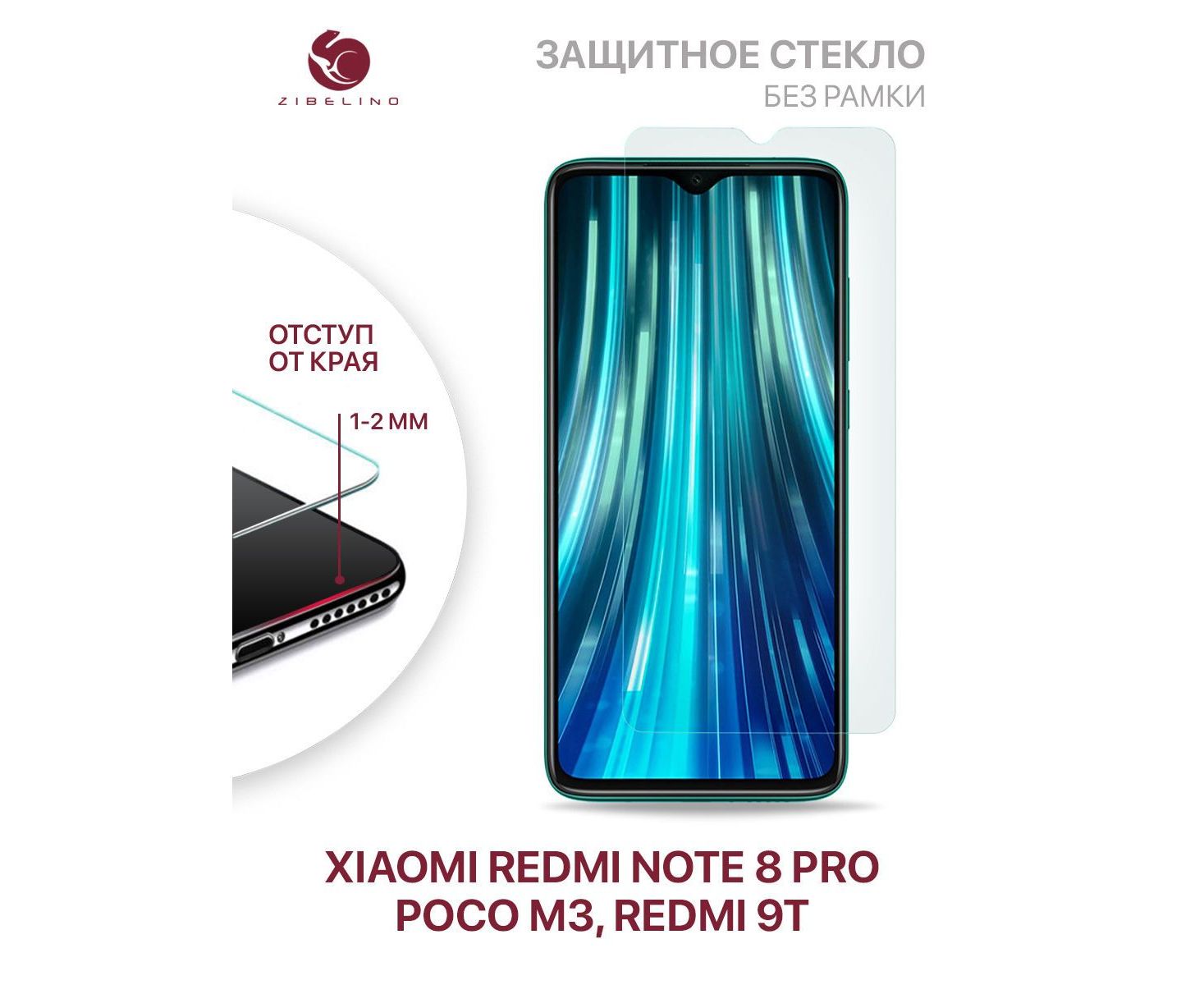Защитное стекло для Xiaomi Redmi Note 8 Pro, Redmi 9T, Poco M3 без рамки, с отступом от краев (Редми Нот 8 Про, Редми 9Т, Поко М3)