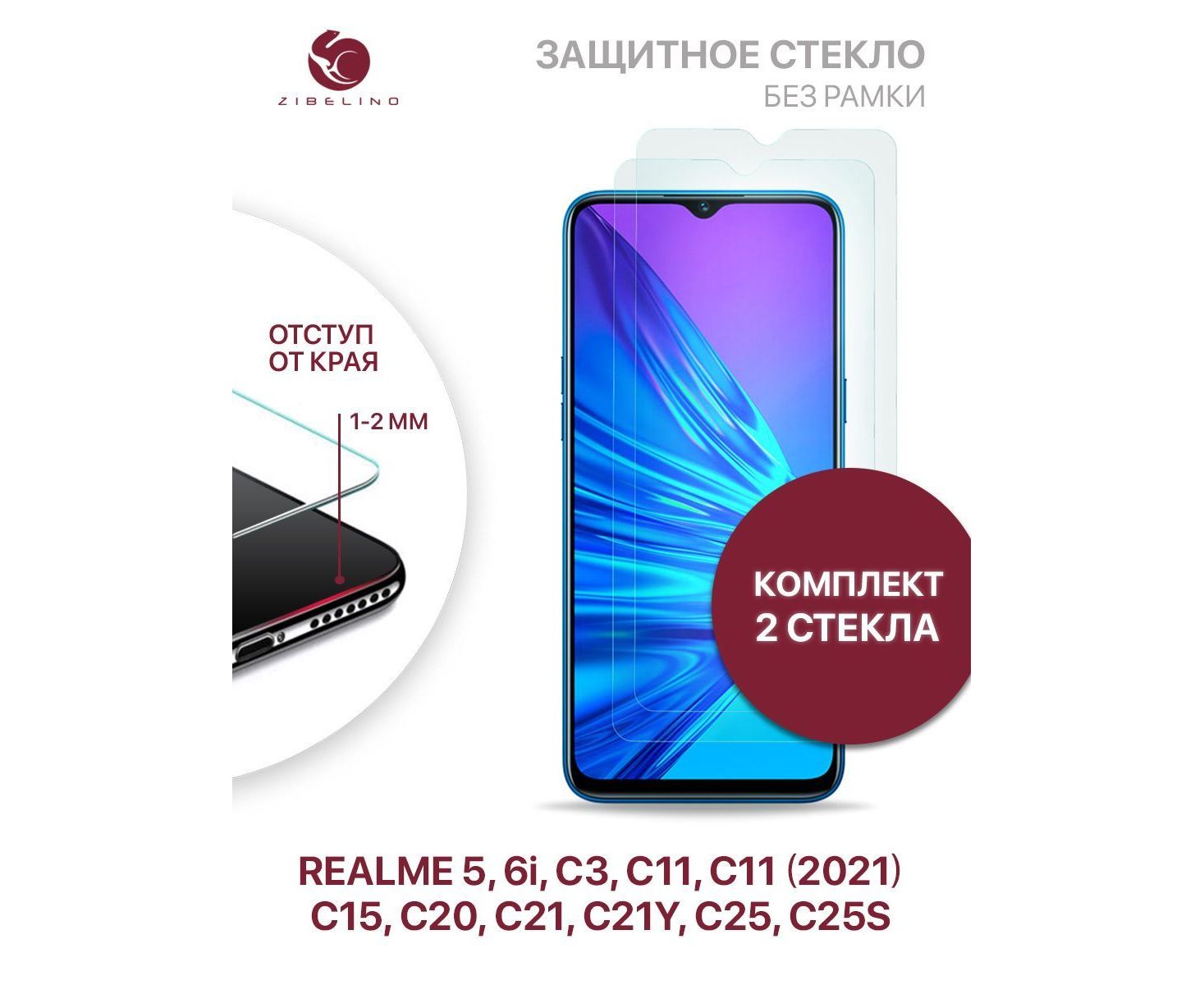 Защитное стекло (Комплект 2 шт) для Realme 5, 6i, С3 С11, C11 2021, C15 C20 С21, C21Y C25, C25S без рамки с отступом от краев, Реалми 5 6i С3 С11 С11 2021 С15 С20 С21 С21У С25 С25S