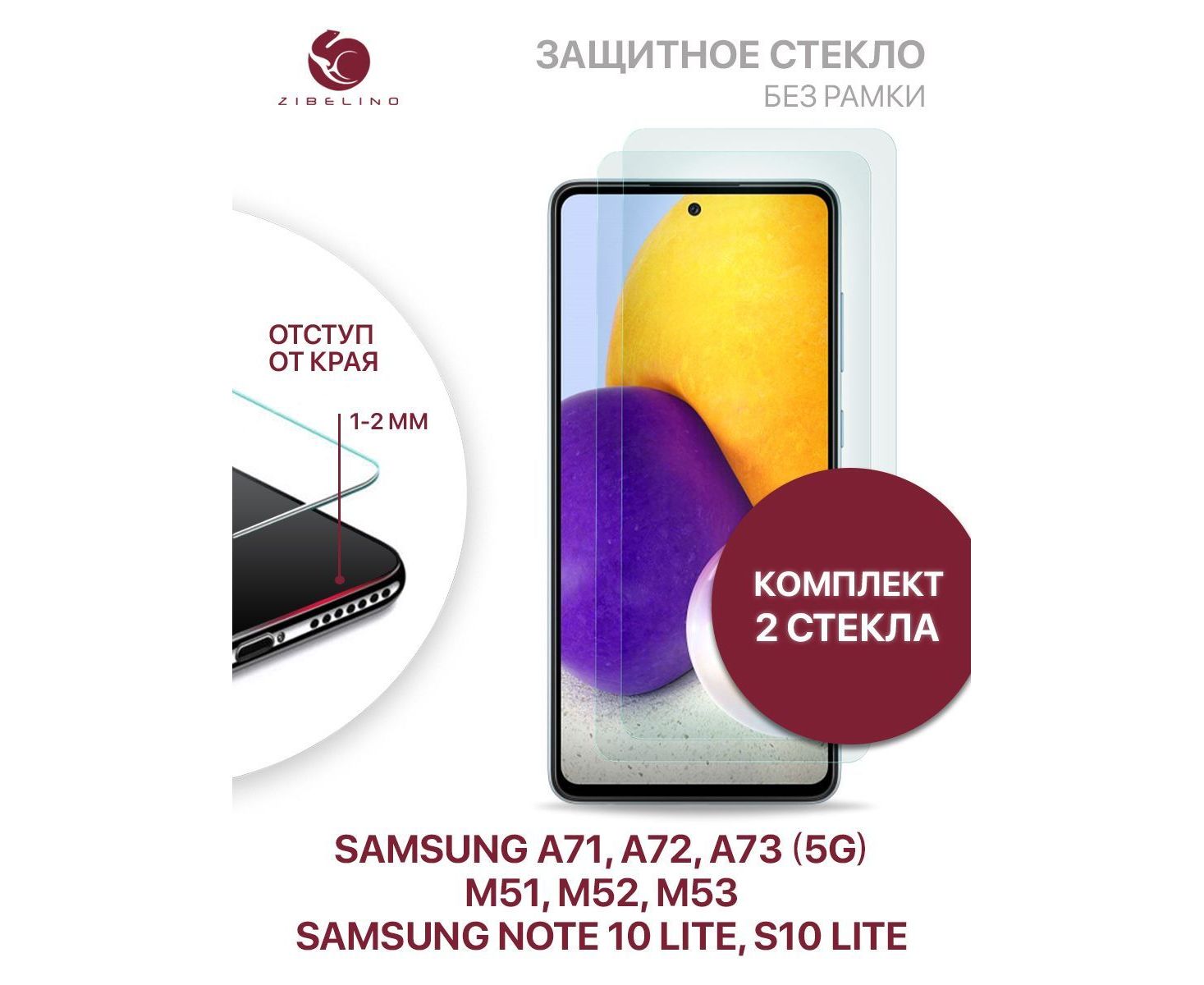 Защитное стекло (Комплект 2 шт) для Samsung A71, A72, A73 (5G), M51, M52 (5G), M53 (5G), M55 (5G), Note 10 Lite, S10 Lite (6.7") без рамки, с отступом от краев, Самсунг Галакси А71 А72 А73 М51 М52 М53 Нот 10 Лайт S10 Лайт