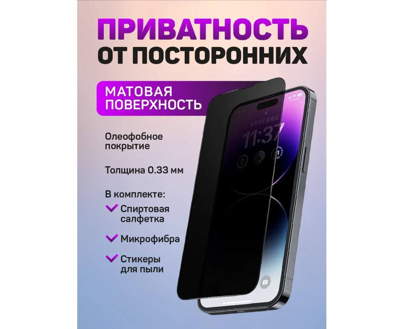 Защитное стекло Антишпион полезный аксессуар, который защищает Ваш смартфон от царапин, трещин и сколов, а так же благодаря технологии антишпион защищает вашу информацию от посторонних. Стекло защитное для позволит надолго сохранить в идеальном состоянии внешний вид смартфона. полностью закрывает экран, при этом накладка на камеру не позволяет песчинкам и другому мелкому мусору проникнуть внутрь и повредить его поверхность. Твердость 9Н - стандарт защитка для будет противостоять деформации и разрушению его поверхностного слоя. Броня защитит от сколов, царапин, а чехол при падениях и ударах, однако его все так же просто клеить, не прибегая к специальным навыкам. Так же благодаря олеофобному покрытию отпечатки пальцев и жирные пятна не будут оставаться на экране вашего будут оставаться на экране вашего девайса. Свое защитное стекло Вы получаете с комплектом где есть всё, для быстрой и удобной наклейки на экран. Поставляется в прочной и надежной упаковке, что исключает повреждения во время транспортировки.